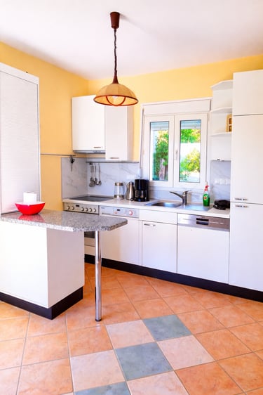Напълно оборудвани кухни – хладилник, фурна, съдомиялна, пералня, голяма маса за хранене