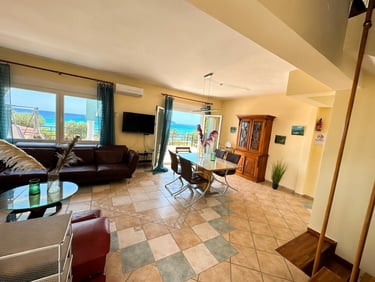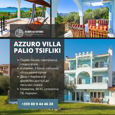 Azzuro View Villa е разположена на брега на мроето в Палио Чифлики, Кавала само на крачка от морския бряг. Мястото предлага пълна уединеност, незабравима панорамна гледка към морето и идеални условия за спокойна семейна почивка.